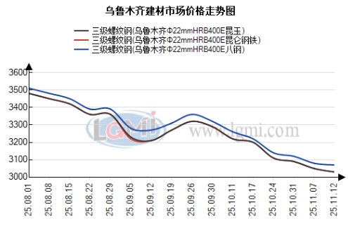根据兰格钢铁云商平台监测数据显示,以乌鲁木齐为例,截至2025年11月12日,乌鲁木齐建材市场HRB400EΦ22mm螺纹钢八钢3070元,昆仑钢铁3030元,昆玉3030元,闽新3030元,大安3020元,新安特3010元,和钢3030元,较上个交易日持稳;HB300Φ8-10mm高线八钢3220元,较上个交易日持稳;HRB400EΦ8-10mm三级盘螺八钢3270元,较上个交易日持稳。
