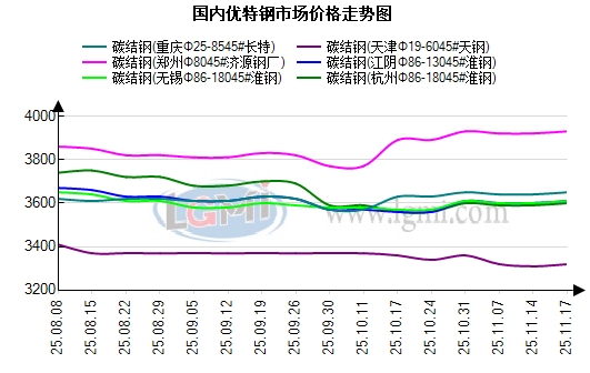 17日国内优特钢市场价格小幅趋强运行,据兰格钢铁云商平台监测数据显示,国内重点城市45#碳结钢85mm平均报价3616元,较上一交易日上涨7元;40Cr合结钢85mm平均报价3771,较上一交易日上涨7元,主要主导城市价格如下:Φ80-130mm45#杭州3520元;常州3450元;重庆3650元;天津3380元,以上主导城市较上一交易日上涨10元。