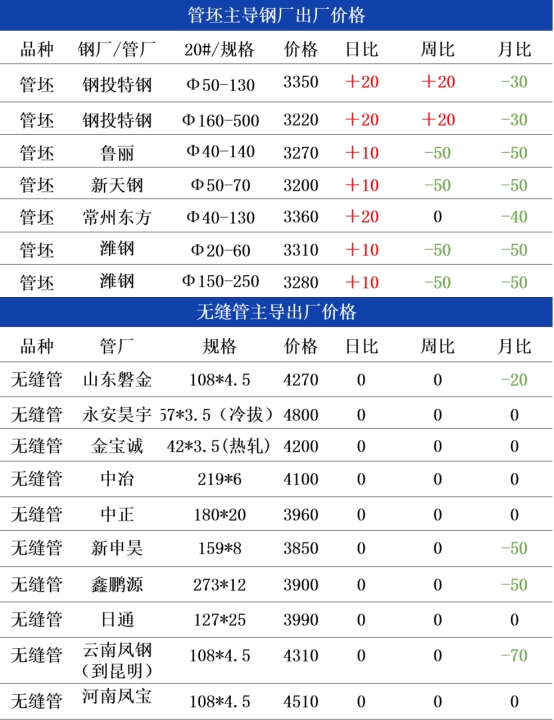 管坯:昨日黑色期货偏强运行,带动管坯价格上行,山东地区管坯价格上调10元,江苏地区管坯价格暂稳,目前管坯成交未达到预期水平,商家一单一议价格模式增多。下游刚需采购为主,多批次、小批量订单成为常态,新增订单有限,虽然钢厂拉涨意愿强烈,但考虑到淡季需求表现疲软,商家跟涨动力不足,加之对后市预期偏弱,现货价格波动空间较为有限,综合来看,预计今日管坯价格持稳运行。