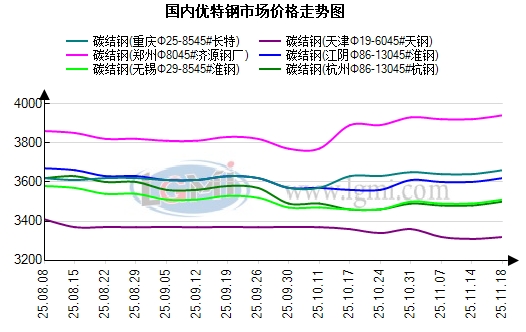 18日国内优特钢市场价格小幅趋强运行,据兰格钢铁云商平台监测数据显示,国内重点城市45#碳结钢85mm平均报价3623元,较上一交易日上涨7元;40Cr合结钢85mm平均报价3778,较上一交易日上涨7元,主要主导城市价格如下:Φ80-130mm45#杭州3530元;常州3460元;重庆3660元;天津3390元,以上主导城市较上一交易日上涨10元。
