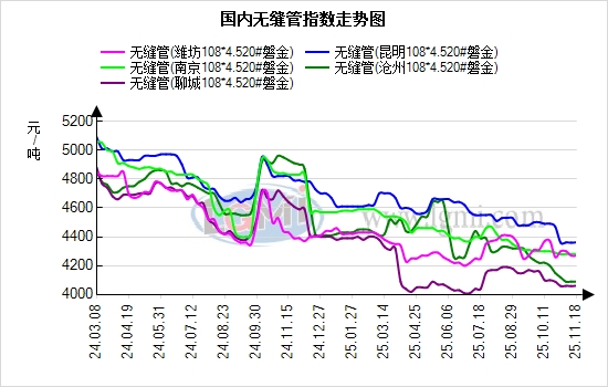 11月18日国内无缝管价格弱稳运行,临沂钢投价格今日价格持稳,现20#热轧管坯市场价格报3350元。据兰格云商平台监测数据显示,国内重点城市108*4.5价格为4380元,较上个交易日价格持平,重点市场沧州报4150元、上海报4280元、无锡报4290元,近期,南北价差略有变化,沧州和江阴价差在70元,江阴较高;上海和山东价差在60元左右,上海较高。