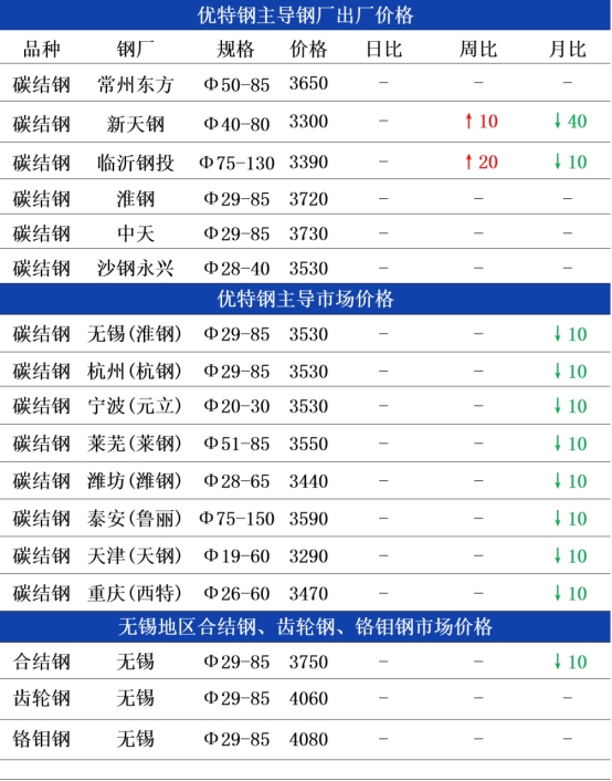 钢厂方面:今日常州东方优特钢出厂价格持稳运行,现45#碳结钢出厂3650元;杭钢优特钢日定价圆钢价格持稳运行,现45#碳结钢出厂3550元,以上均为含税价格;临沂钢投优特钢出厂格持稳运行,现45#碳结钢出厂3390元;天钢优特钢出厂价格持稳运行,现45#碳结钢出厂3300元。目前优特钢企业早间偏稳居多,厂家们部分维持观望,成交仍无明显改善。