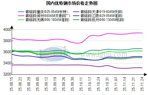 钢厂方面:今日常州东方优特钢出厂价格持稳运行,现45#碳结钢出厂3650元;杭钢优特钢日定价圆钢价格持稳运行,现45#碳结钢出厂3550元,以上均为含税价格;临沂钢投优特钢出厂格持稳运行,现45#碳结钢出厂3370元;天钢优特钢出厂价格下调10元,现45#碳结钢出厂3270元。