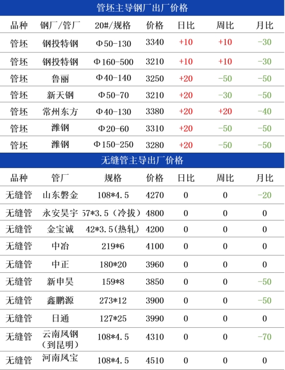 管坯:昨日期货盘面呈上行趋势,山东地区管坯价格上调10元,江苏地区管坯价格上调10元,市场价格小幅上涨。需求虽然疲软 ,但钢厂检修尚未结束,库存持续降低,供需矛盾缓和。下游采购小有增量,成交好转,钢厂锁单同样增量。综合来看,预计今日管坯价格偏强运行。