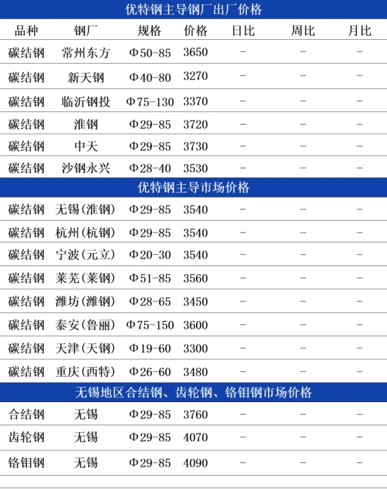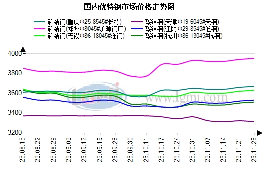 市场方面:上周盘面表现对于优特钢市场也暂无实质助力,优特钢市场各方纷纷主稳观望应对,部分商家也为了在上周末11月剩下的这几天内争取出货而窄幅摇摆报价。就当前场内流通反馈看,属实一般,成交在上周的集中释放后沉寂下来,若后续无实质转变,场内行情或将保持此状态应对,量价都不太会有大的波动。现货方面,分地区来看,华东地区从锡杭等地了解,碳合结钢资源主流报价主稳,轴承钢、铬钼钢资源主流维持坚挺,无论何种小品种均挺价企稳,成交偏静。华北、华中地区优特钢市场价格较上周持平,代理商户齐稳定,个别高位有为促成交小幅10元左右的下移,场内采购压价找便宜,商家与其僵持。其中碳合结钢资源主流报稳,轴承钢、齿轮钢资源稳。综上,目前优特钢市场量价都未有十分激进的起伏表现,在场各方别无他法只能耐心等待过渡,不过努力吆喝亦会夹在其中,同时商家期待本月何时会迎来转机。