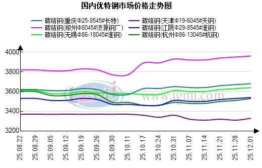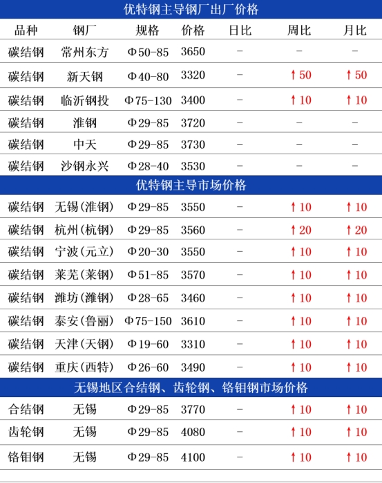 钢厂方面:今日常州东方优特钢出厂价格持稳运行,现45#碳结钢出厂3650元;杭钢优特钢日定价圆钢价格上调10元,现45#碳结钢出厂3570元,以上均为含税价格;临沂钢投优特钢出厂格持稳运行,现45#碳结钢出厂3400元;天钢优特钢出厂价格持稳运行,现45#碳结钢出厂3320元。受月初黑色系红盘提振,日定价钢企多窄幅上行出厂价格以观成交。
