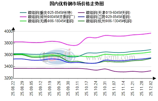 2日国内优特钢市场价格小幅趋强运行,据兰格钢铁云商平台监测数据显示,国内重点城市45#碳结钢85mm平均报价3645元,较上一交易日上涨7元;40Cr合结钢85mm平均报价3800,较上一交易日上涨7元,主要主导城市价格如下:Φ80-130mm45#杭州3570元;常州3490元;重庆3690元;天津3420元,以上主导城市较上一交易日上涨10元。