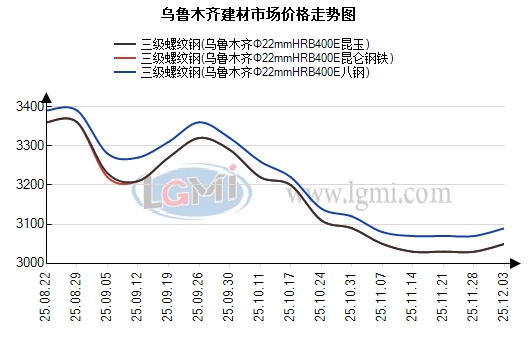 根据兰格钢铁云商平台监测数据显示,以乌鲁木齐为例,截至2025年12月3日,乌鲁木齐建材市场HRB400EΦ22mm螺纹钢八钢3090元,昆仑钢铁3050元,昆玉3050元,闽新3050元,大安3040元,新安特3030元,和钢3050元,较上个交易日持稳;HB300Φ8-10mm高线八钢3240元,较上个交易日持稳;HRB400EΦ8-10mm三级盘螺八钢3290元,较上个交易日持稳。