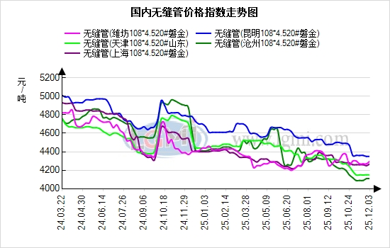 12月3日国内无缝管价格持稳运行,临沂钢投价格今日价格持稳,现20#热轧管坯市场价格报3360元。据兰格云商平台监测数据显示,国内重点城市108*4.5价格为4380元,较上个交易日价格持平,重点市场沧州报4120元、上海报4220元、无锡报4230元,近期,南北价差略有变化,沧州和江阴价差在70元,江阴较高;上海和山东价差在60元左右,上海较高。