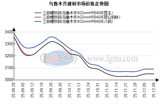 根据兰格钢铁云商平台监测数据显示,以乌鲁木齐为例,截至2025年12月8日,乌鲁木齐建材市场HRB400EΦ22mm螺纹钢八钢3090元,昆仑钢铁3050元,昆玉3050元,闽新3050元,大安3040元,新安特3030元,和钢3050元,较上个交易日持稳;HB300Φ8-10mm高线八钢3240元,较上个交易日持稳;HRB400EΦ8-10mm三级盘螺八钢3290元,较上个交易日持稳。