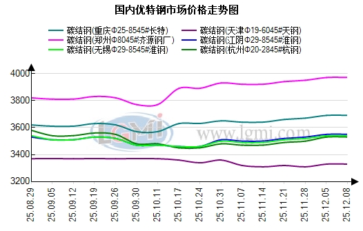 8日国内优特钢市场价格主稳运行,据兰格钢铁云商平台监测数据显示,国内重点城市45#碳结钢85mm平均报价3646元,较上一交易日持稳运行;40Cr合结钢85mm平均报价3801,较上一交易日持稳,主要主导城市价格如下:Φ80-130mm45#杭州3570元;常州3490元;重庆3690元;天津3420元,以上主导城市较上一交易日持稳。