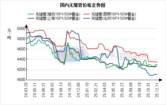 12月11日国内无缝管市场价格整体维持平稳运行,局部管厂出现小幅调价动作。其中,临沂钢投管坯价格今日下调10元/吨,当前20#热轧管坯市场报价为3320元/吨。据兰格云商平台监测数据显示,国内重点城市108*4.5规格无缝管均价为4380元/吨,与上个交易日持平;从区域报价来看,重点市场沧州报4120元/吨、上海报4220元/吨、无锡报4230元/吨。值得关注的是,近期南北区域价差呈现小幅波动,沧州与江阴价差为60元/吨,江阴价格偏高;上海与山东价差约70元/吨,上海价格处于高位。