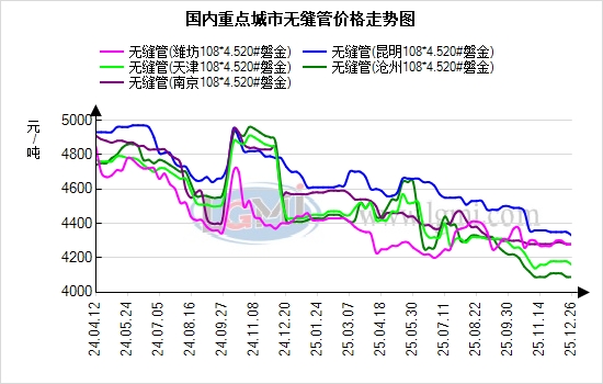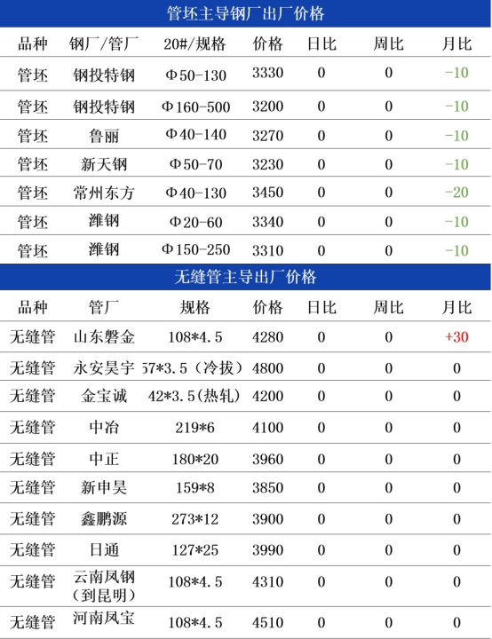 管坯:上周国内管坯市场呈现短暂反弹后回落的震荡态势,南北区域走势分化明显。前期黑色系期货高位震荡对现货有阶段性提振,华东、华北核心区域价格曾小幅上调10-20元,但上涨动能后续快速衰减,缺乏持续向上驱动逻辑,周五随期货走弱及终端采购不足,部分北方企业小幅降价20元左右出货。需求端表现依旧疲软,终端制造业采购意愿低迷,实际采购量未出现实质性改善,加之无缝管成品端库存去化压力显著,直接抑制管坯环节实际消耗需求,市场成交氛围整体偏淡。贸易商为加快出货节奏,多针对批量订单采取10-20元的隐性让利策略,但并未带动成交放量,整体交易活跃度不及预期。当前临沂钢投20#热轧管坯报价稳定在3330元/吨,南方区域价格相对坚挺,北方部分企业回调后趋于平稳。综合来看,预计今日管坯价格以持稳运行为主,局部区域或维持小幅议价空间,整体供需弱平衡格局难有突破。
