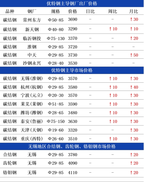 钢厂方面:今日常州东方优特钢出厂价格持稳运行,现45#碳结钢出厂3690元;杭钢优特钢日定价圆钢价格持稳运行,现45#碳结钢出厂3610元,以上均为含税价格;临沂钢投优特钢出厂价格持稳运行,现45#碳结钢出厂3370元;天钢优特钢出厂价格持稳运行,现45#碳结钢出厂3290元。目前原料价格运行平稳,钢企成本压力无波动,下游终端按需补库为主,需求端支撑平稳,优特钢企端月末多持稳运行。