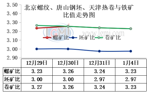 1月4日螺矿比3.23较上一交易日收窄0.01,坯矿比2.97较上一交易日持平,卷矿比3.23较上一交易日收窄0.01。