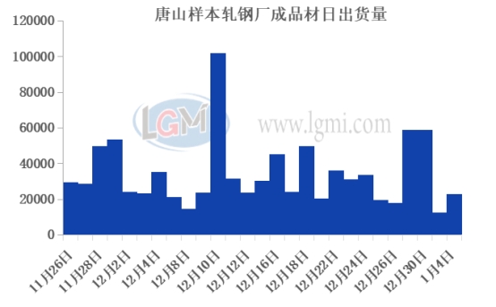 截止2026年1月4日据统计截止16:00唐山20家型材钢厂出货总量约22900吨,较上一交易日增83.2%,其中工字钢300吨;槽钢8000吨;角钢14600吨。