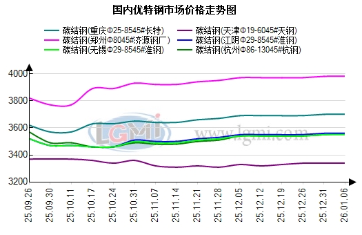 钢厂方面:今日常州东方优特钢出厂价格持稳运行,现45#碳结钢出厂3690元;杭钢优特钢日定价圆钢价格持稳运行,现45#碳结钢出厂3620元,以上均为含税价格;临沂钢投优特钢出厂格持稳运行,现45#碳结钢出厂3360元;天钢优特钢出厂价格下调10元,现45#碳结钢出厂3270元。今日黑色系期螺走势低迷,部分钢企小幅下调出厂价格。
