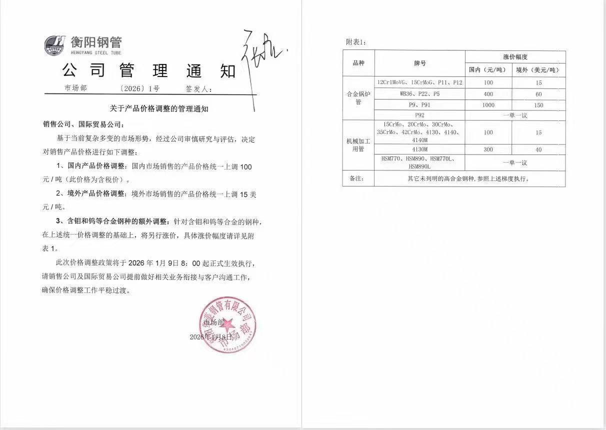 关于衡阳钢管价格调整的通知