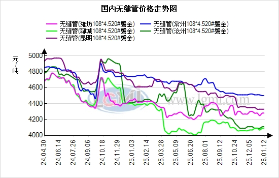 1月12日国内无缝管市场价格持稳运行。临沂钢投管坯价格今日价格上调10元,当前20#热轧管坯市场报价为3350元/吨。据兰格云商平台监测数据显示,国内重点城市108*4.5规格无缝管均价为4300元/吨,与上个交易日基本持平;从区域报价来看,重点市场沧州报4010元/吨、上海报4190元/吨、无锡报4200元/吨。值得关注的是,近期南北区域价差呈现小幅波动,沧州与江阴价差为60元/吨,江阴价格偏高;上海与山东价差约70元/吨,上海价格处于高位。