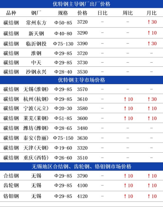 钢厂方面:今日常州东方优特钢出厂价格持稳运行,现45#碳结钢出厂3720元;杭钢优特钢日定价圆钢价格持稳运行,现45#碳结钢出厂3650元,以上均为含税价格;临沂钢投优特钢出厂格持稳运行,现45#碳结钢出厂3390元;天钢优特钢出厂价格持稳运行,现45#碳结钢出厂3290元。目前下游终端多按需补库,日定价钢企多持稳运行为主。