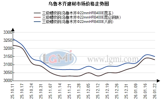 根据兰格钢铁云商平台监测数据显示,以乌鲁木齐为例,截至2026年1月22日,乌鲁木齐建材市场HRB400EΦ22mm螺纹钢八钢3150元,昆仑钢铁3130元,昆玉3130元,闽新3130元,大安3120元,新安特3120元,和钢3110元,较上个交易日持平;HB300Φ8-10mm高线八钢3300元,较上个交易日持平;HRB400EΦ8-10mm三级盘螺八钢3350元,较上个交易日持平。