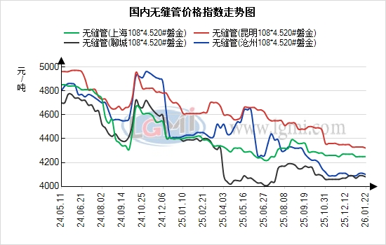 1月22日国内无缝管市场价格持稳为主。临沂钢投管坯价格今日价格稳,当前20#热轧管坯市场报价为3310元/吨。据兰格云商平台监测数据显示,国内重点城市108*4.5规格无缝管均价为4230元/吨,与上个交易日基本持平;从区域报价来看,重点市场沧州报4010元/吨、上海报4150元/吨、无锡报4160元/吨。值得关注的是,近期南北区域价差呈现小幅波动,沧州与江阴价差为60元/吨,江阴价格偏高;上海与山东价差约70元/吨,上海价格处于高位。