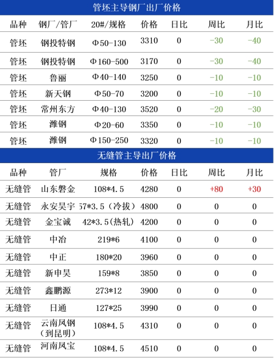 综合来看,今日管坯市场受成本支撑、供给平稳及下游无缝管稳价传导的多重影响,价格下行压力有限,上涨动能则受需求制约难以释放。预计今日华东、华北主流产区20#热轧管坯报价维持3320-3480元/吨区间运行,核心钢厂报价基本持平,局部或有10元/吨以内的小幅上调。需重点关注今日双焦期货走势及下游无缝管厂采购需求变化,若焦炭提涨有新进展或能小幅提振市场情绪,若补库需求阶段性收尾则可能抑制价格上涨势头。