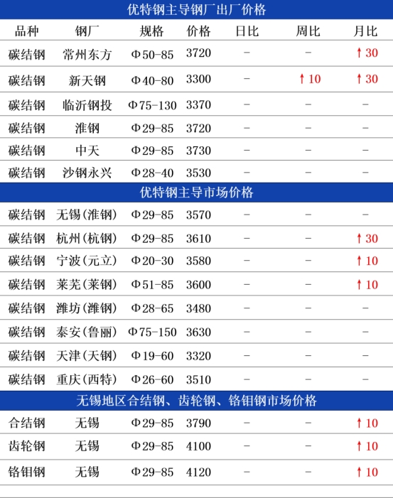 钢厂方面:今日常州东方优特钢出厂价格持稳运行,现45#碳结钢出厂3720元;杭钢优特钢日定价圆钢价格持稳运行,现45#碳结钢出厂3650元,以上均为含税价格;临沂钢投优特钢出厂格持稳运行,现45#碳结钢出厂3370元;天钢优特钢出厂价格持稳运行,现45#碳结钢出厂3300元。目前淡季深入,日定价钢企早盘多持稳运行,钢厂端多随行就市为主。