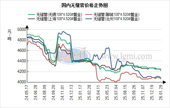 1月29日国内无缝管市场价格持稳为主。临沂钢投管坯价格今日价格上调10元,当前20#热轧管坯市场报价为3330元/吨。据兰格云商平台监测数据显示,国内重点城市108*4.5规格无缝管均价为4230元/吨,与上个交易日基本持平;从区域报价来看,重点市场沧州报4010元/吨、上海报4150元/吨、无锡报4160元/吨。值得关注的是,近期南北区域价差呈现小幅波动,沧州与江阴价差为60元/吨,江阴价格偏高;上海与山东价差约70元/吨,上海价格处于高位。