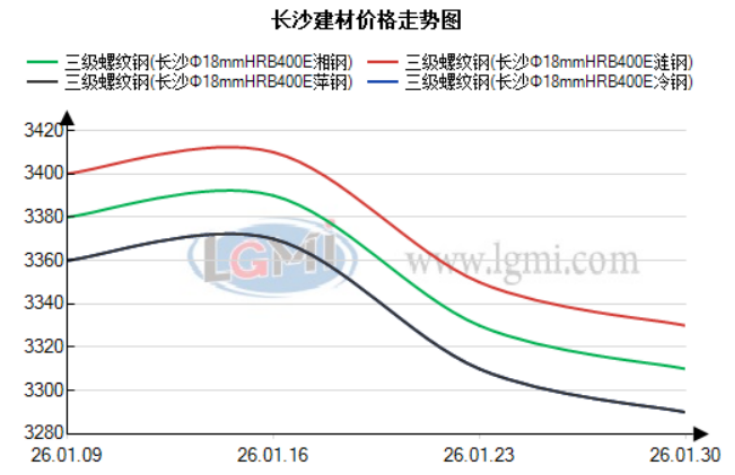 1月长沙建材价格呈现“前涨后跌”的窄幅震荡格局,整体波动幅度有限。月初受宏观政策暖风与盘面冲高带动,价格稳步走强:第一周螺纹钢涨50元/吨、盘螺涨60元/吨,萍钢抗震螺纹基价升至 3360元/吨;第二周价格延续小幅走强态势,螺纹钢再涨10元/吨,盘螺涨30元/吨,基价分别达3370元/吨、3560元/吨。但进入中下旬,受雨雪天气、需求收缩及盘面回落影响,价格持续走弱,第三周螺纹钢大跌60元/吨,第四周再跌20元/吨。截至1月30日,萍钢抗震螺纹Ф18*9m 单价3290元/吨,Ф8 抗震盘螺 3480元/吨,月内螺纹微跌20元/吨,盘螺微涨10元/吨,整体呈现窄幅盘整特征。