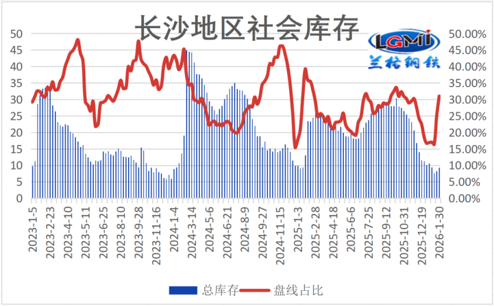 2月16日除夕叠加元宵节假期影响,市场将进入“需求停滞、供应稳增”的传统累库周期。需求端来看,建筑工地将大面积停工,终端采购基本停滞,预计全月成交量较1月大幅下滑,仅节前或有少量刚需备货。供应端,主流钢厂仍将正常生产,对长沙地区投放维持稳定,预计社会库存将延续1月下旬的累库态势,且增幅可能加快,需重点关注累库斜率是否超预期。