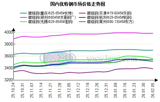 市场方面:今日国内优特钢市场全域延续持稳运行态势,核心品种报价无任何涨跌波动,价格走势平稳可控。当前春节假期氛围愈发临近,市场交易节奏持续放缓,各类市场参与者操作心态趋于平缓,均以随行就市为核心原则,市场情绪整体呈现佛系态势,未出现明显波动。虽无明显盘面强支撑,但供需弱平衡格局持续发力,叠加市场普遍的随行就市共识,有效托举价格平稳运行。据兰格钢铁网数据,分地区来看:华东地区无锡、杭州两大核心市场同步维持持稳态势,碳合结钢、轴承钢、齿轮钢等全品类报价保持恒定,无任何微调动作。当地贸易商以“随行稳价、刚需对接”为核心操作导向,临近春节假期,不再刻意调控库存规模,既不盲目囤货也不刻意去库,操作重心聚焦于承接下游刚需订单;高端品种资源紧俏格局未发生实质改变,交投全程以下游刚需衔接为核心,成交频次保持平稳,未现增量成交支撑。华北、华中地区优特钢市场协同持稳,未出现区域分化走势,碳合结钢价格体系扎实无松动,市场流通资源供需维持弱平衡状态,无低价货源扰乱市场竞争秩序。各品种代理商坚守报价底线,严格遵循随行就市的操作思路,无主动调整价格的行为,区域内买卖双方均受春节假期临近影响,观望心态温和,佛系博弈特征凸显,交投节奏平缓有序,成交规模维持常态,市场运行态势整体可控。需求端方面,春节假期氛围愈发临近,下游采购全程以刚需为主导,终端制造企业受节前生产节奏收缩影响,采购行为更趋理性,综上,随着春节假期愈发临近,市场交易节奏或将进一步放缓,各类参与者的操作思路仍将以随行就市为主。预计明日全国优特钢市场将继续延续全域持稳态势。