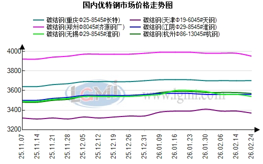 市场方面:今日为春节假期后开市首个交易日,国内优特钢市场未现开门红,主流品种报价呈现小幅下跌态势,整体运行偏弱调整。黑色系期货全天震荡走弱,对现货市场形成明显拖累,叠加下游复工节奏偏慢,市场谨慎观望情绪显著升温,成为主导今日行情的核心因素。据兰格钢铁网数据,分地区来看:华东地区无锡、杭州两大核心市场同步偏弱运行,碳合结钢、轴承钢、齿轮钢等主流品种报价小幅下跌10-30元,市场报价体系随期货走弱顺势松动,商家报价心态偏谨慎,主动让利走货现象小幅增多。华北、华中地区优特钢市场同步跟随下行,未出现区域逆势走强迹象,碳合结钢价格重心小幅下移,市场流通资源交投清淡,暂无集中采购支撑价格,商家多以试探性报价为主,观望情绪浓厚。需求端方面,今日下游终端企业复工率偏低,多数制造企业仍处于节后返岗筹备阶段,采购意愿尚未恢复,节前补库库存仍有一定余量,暂无集中补库动作。采购行为以观望询价为主,实际下单量偏少,仅少数刚需企业按需少量采购,对市场支撑力度有限。受期货走弱与复工延迟双重影响,下游采购节奏进一步放缓,整体成交表现冷清。综上,今日优特钢市场受期货走弱、复工不及预期影响,开市小幅下跌、未现开门红,市场观望情绪浓厚。预计明日优特钢市场仍将维持谨慎运行态势,价格以窄幅调整为主。