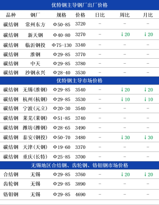 钢厂方面:今日常州东方优特钢出厂价格持稳运行,现45#碳结钢出厂3720元;杭钢优特钢日定价圆钢价格持稳运行,现45#碳结钢出厂3650元,以上均为含税价格;临沂钢投优特钢出厂格持稳运行,现45#碳结钢出厂3340元;天钢优特钢出厂价格持稳运行,现45#碳结钢出厂3270元。市场刚开市,日定价优特钢企业早盘多持稳为主,观望一下日内成交及市场情绪后再做调整。