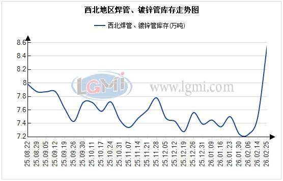 2月份,西北地区焊管社会库存呈现全面上涨态势。据兰格钢铁网统计,截至2月25日,西北地区镀锌管、焊管主导城市社会库存总量为8.55万吨。从环比看,月环比上涨18.05%,季环比上涨9.89%,从同比看,年同比下降6.46%。本月库存结构呈现明显季节性特征。一方面,春节假期市场需求处于年度低点,下游采购基本停滞;另一方面,贸易商对节后行情普遍看好,节前已进行补库操作,导致库存水平较上月有所回升。但受制于对后市谨慎预期,整体补库规模有限,库存总量仍低于去年同期水平。