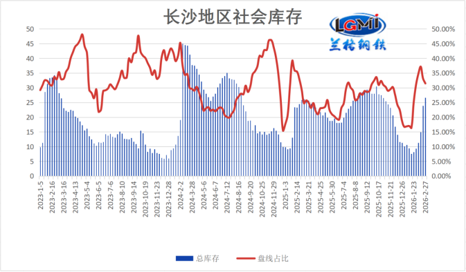 二月末,长沙建材社会库存累库,2月27日统计社会库存量为26.67万吨,比1月30日增17.32万吨。3月上旬,主流品牌部分钢厂正常生产,预计社库或延续累库。