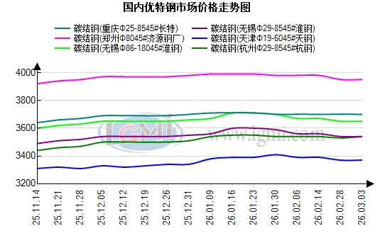 市场方面:昨日国内优特钢市场主稳运行,主流品种报价平稳整理,价格整体保持坚挺。市场情绪温和理性,商家操作节奏平稳,暂无明显调价冲动。下游企业复工复产持续推进,返岗与产能恢复节奏加快,但需求集中释放仍需时间,实质性采购放量有限,价格上行动力略显不足,成为当前市场主要特征。据兰格钢铁网数据监测,分地区来看:华东无锡、杭州核心市场报价持稳运行,碳合结钢、轴承钢、齿轮钢等品种价格稳定,商家心态平稳,询单氛围温和,成交以刚需对接为主,整体交投有序。华北、华中地区同步持稳运行,区域走势无明显分化,市场供需维持弱平衡状态,库存压力不大,商家报价随行就市,操作谨慎有序。目前市场已进入“金三”传统旺季,行业对后续需求回暖抱有良好预期,对市场形成一定情绪支撑。综上,短期市场在旺季预期与需求逐步恢复的双重影响下保持平稳,需求释放节奏仍是关键。预计今日国内优特钢市场继续持稳运行,价格波动空间有限,整体维持稳势运行。