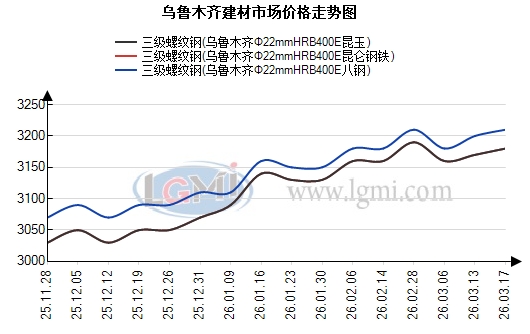根据兰格钢铁云商平台监测数据显示,以乌鲁木齐为例,截至2026年3月17日,乌鲁木齐建材市场HRB400EΦ22mm螺纹钢八钢3210元,昆仑钢铁3180元,昆玉3180元,闽新3180元,大安3170元,新安特3170元,和钢3160元,较上个交易日上行10元;HB300Φ8-10mm高线八钢3410元,较上个交易日上行10元;HRB400EΦ8-10mm三级盘螺八钢3460元,较上个交易日上行10元。