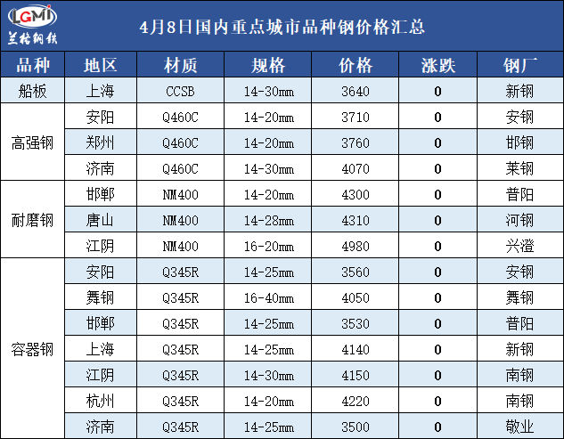 4月8日国内重点城市品种钢价格汇总