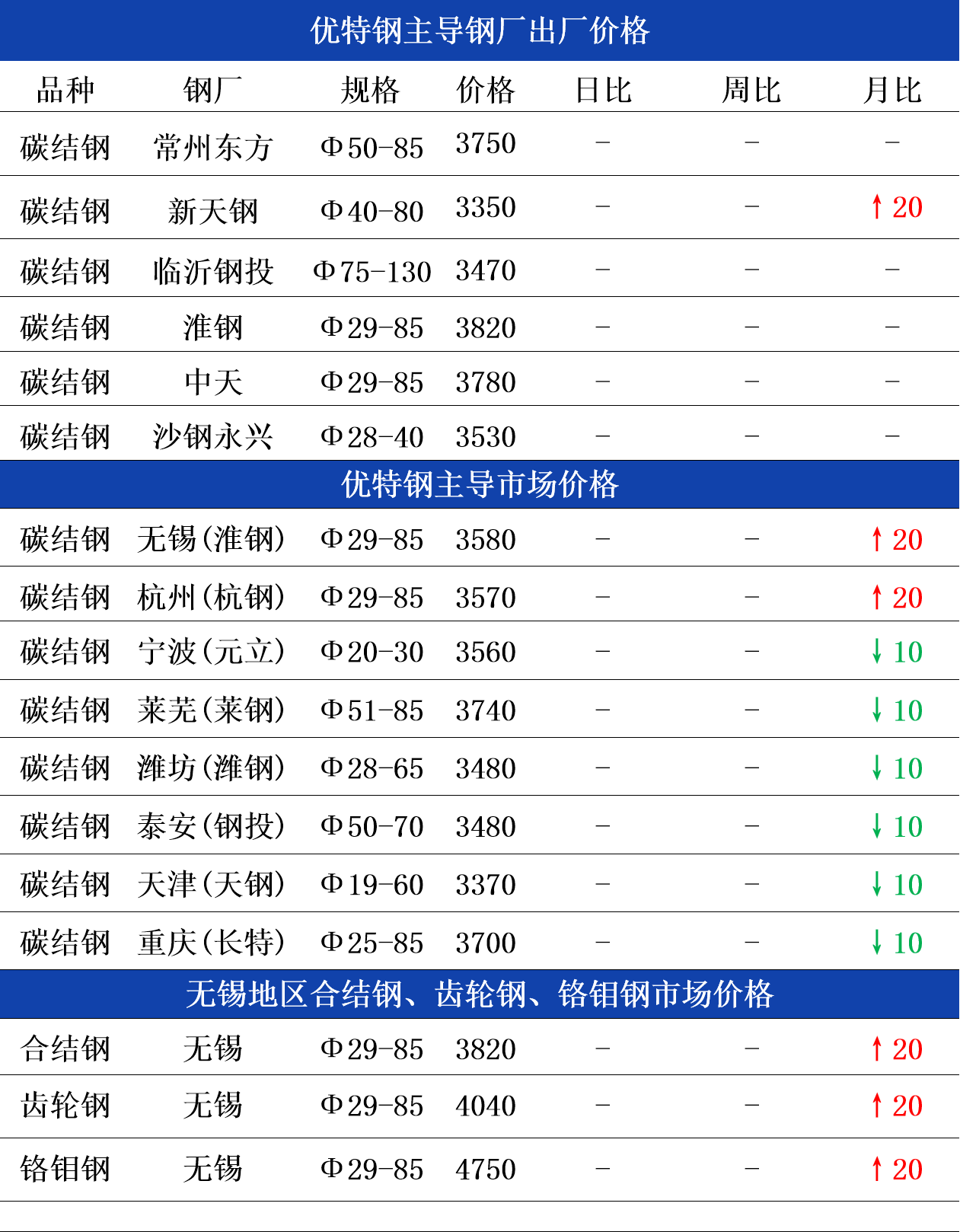 钢厂方面:今日常州东方优特钢出厂价格持稳运行,现45#碳结钢出厂3750元;杭钢优特钢日定价圆钢价格持稳运行,现45#碳结钢出厂3660元,以上均为含税价格;临沂钢投优特钢出厂价格持稳运行,现45#碳结钢出厂3450元;天钢优特钢出厂价格持稳运行,现45#碳结钢出厂3330元。早盘日定价优特钢企多持稳运行,钢厂端多观望成交后再做价格调整。
