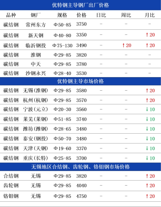 钢厂方面:今日常州东方优特钢出厂价格持稳运行,现45#碳结钢出厂3750元;杭钢优特钢日定价圆钢价格持稳运行,现45#碳结钢出厂3660元,以上均为含税价格;临沂钢投优特钢出厂价格持稳运行,现45#碳结钢出厂3490元;天钢优特钢出厂价格持稳运行,现45#碳结钢出厂3350元。早盘钢厂报价持稳,主因成本支撑稳固、需求温和放量。昨日局部调价后,市场情绪趋稳,原料高位托底成本,叠加库存合理、供需弱平衡,钢厂暂无调价动力,故今日早盘多集中持稳观望。