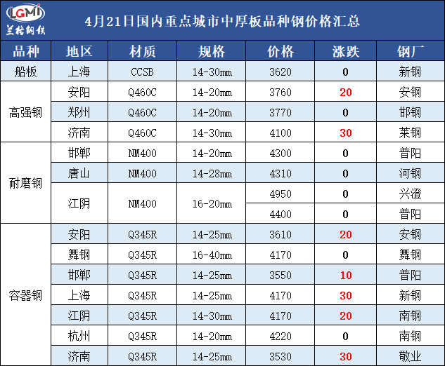 - 4月21日国内重点城市中厚板品种钢价格汇总2026/4/21