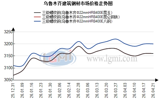 根据兰格钢铁云商平台监测数据显示,以乌鲁木齐为例,截至2026年4月21日,乌鲁木齐建材市场HRB400EΦ22mm螺纹钢八钢3200元,昆仑钢铁3160元,昆玉3160元,闽新3160元,大安3150元,新安特3150元,和钢3140元,较上个交易日持稳;HB300Φ8-10mm高线八钢3400元,较上个交易日持稳;HRB400EΦ8-10mm三级盘螺八钢3450元,较上个交易日持稳。