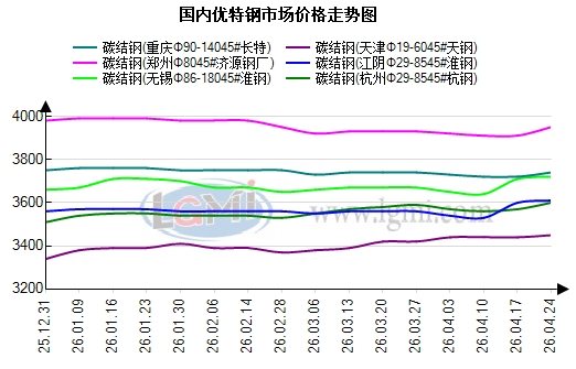 市场方面:上周六日国内优特钢全域行情平稳运行,整体行情节奏平缓有序,市场交投节奏放缓,下游终端理性采购模式,整体交易体量维持常规水平。据兰格钢铁网数据监测,全国优特钢各主流品类价格体系稳固。分地区来看,华东锡杭核心集散区域行情平稳过渡,前期价格波动节奏逐步收敛,碳合结钢各类资源报价平稳维系,商户理性研判后市,以稳价经营为核心思路。市场流通货源结构保持稳定,高端用材品类上行节奏放缓,轴承钢、齿轮钢等特钢品种凭借自身刚需底座,价位稳固不移,区域流通交易节奏舒缓有序。华北、华中两大片区特钢行情同步平稳演绎,常规碳结、合结钢售价保持恒定,高规格特钢品类长期稳居高位,具备良好的行情抗压属性。各地商户从容规划出货节奏,以灵活接单、稳价走货为主要策略,终端按需采买特征凸显,区域整体交投保持温和平淡的状态。综上,现阶段国内优特钢市场需求释放节奏平缓有序,供需两端维持良性制衡态势,行情既无上行契机,亦无下行压力,短期优特钢市场或将延续平稳演绎的运行节奏。