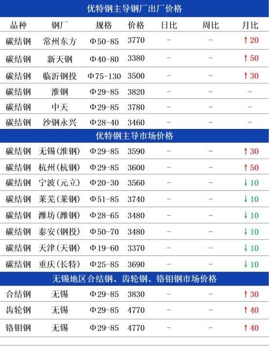 钢厂方面:今日常州东方优特钢出厂价格持稳运行,现45#碳结钢出厂3770元;杭钢优特钢日定价圆钢价格持稳运行,现45#碳结钢出厂3680元,以上均为含税价格;临沂钢投优特钢出厂价格持稳运行,现45#碳结钢出厂3500元;天钢优特钢出厂价格持稳运行,现45#碳结钢出厂3380元。新周开市,早盘日定价钢企出厂依旧主稳运行为主,观望今日期货走向和成交情况再做价格调整。