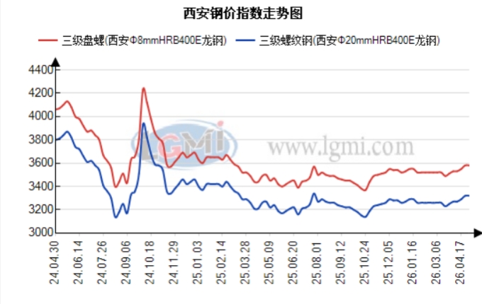 4月份西安建材市场整体呈震荡趋强的态势。据兰格钢铁云商市场监测数据显示:截止4月27日西安地区龙钢20mm三级抗震螺纹钢含税理计3320元(吨价,下同),环比上月涨70元。西安地区龙钢8mm三级抗震盘螺含税过磅3580元,环比上月涨70元。